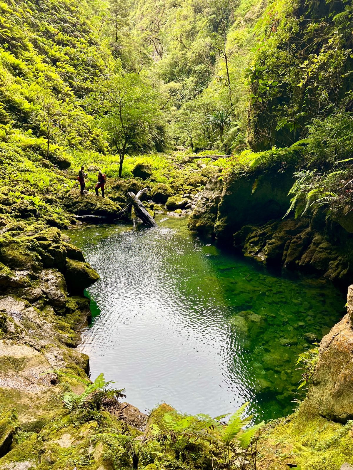 Ce n'est que le 3 février que Michel et Bernard atteindront le fond de ce canyon sec, grâce à deux jets de cordes de 10 et 15 mètres environ, fractionnés sur une fougère arborescente. Après quelques centaines de mètres vers l'aval, ils atteignent un rétrécissement marqué par un ressaut, suivi de deux marmites de géant encombrées de troncs d'arbres coincés. Le canyon devient plus encaissé, plus sinueux. Faute de matériel suffisant, ils ne peuvent franchir les obstacles.