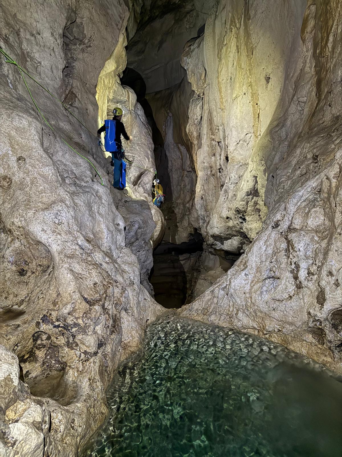 Le lendemain, une nouvelle équipe constituée de Natalia, Franck et Joash revient sur site et poursuit la descente. Elle atteint le haut d'une falaise d'où un caillou lancé dans le vide met plus de cinq secondes avant d'atteindre l'eau. « A cave ! (une grotte) » s'écrie Joash du haut d'un arbre. Une perte semble bien visible en contrebas mais l'accès reste verrouillé.