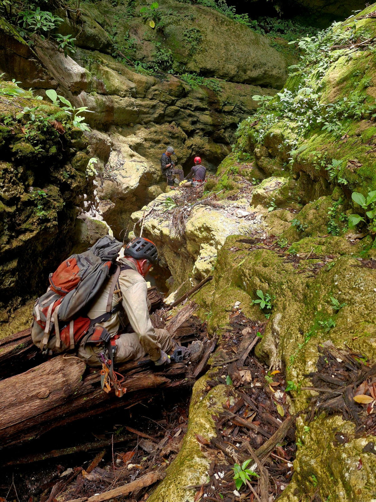 Pour le camp 3, les prospections peuvent enfin commencer. Le camp est situé entre deux dolines de belles dimensions et les premiers objectifs sont tout trouvés. Une équipe composée de Yann R, Patrick, Sophie, Natalia et Franck s'oriente vers la doline à l'est. La taille n'est pas trop compliquée, le cheminement assez évident : il suffit de suivre le talweg qui part du camp. Au fur et à mesure de la progression, d'autres talwegs s'y greffent et enfin, après seulement 270 m de progression et 60 m de dénivelé négatif, l'équipe arrive à une belle entrée verticale creusée à la faveur d'une diaclase. Une verticale de plus de 25 m laisse entrevoir un grand vide : enfin un beau trou ! L'exploration sera pour le lendemain. La présence de nombreuses fougères arborescentes autour de la cavité lui donne son nom : ce sera le gouffre Gauunu, le nom de cette plante dans la langue mengen.