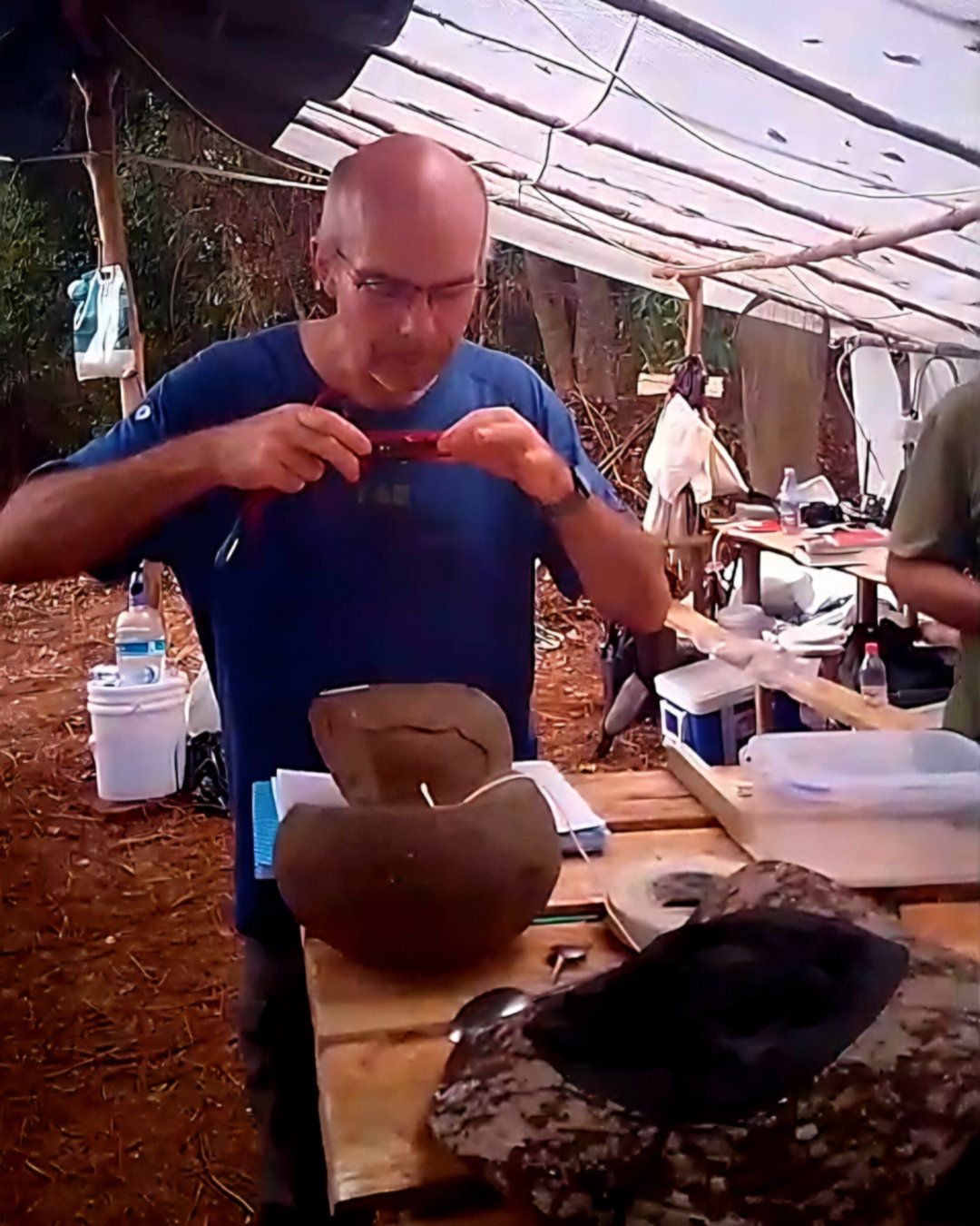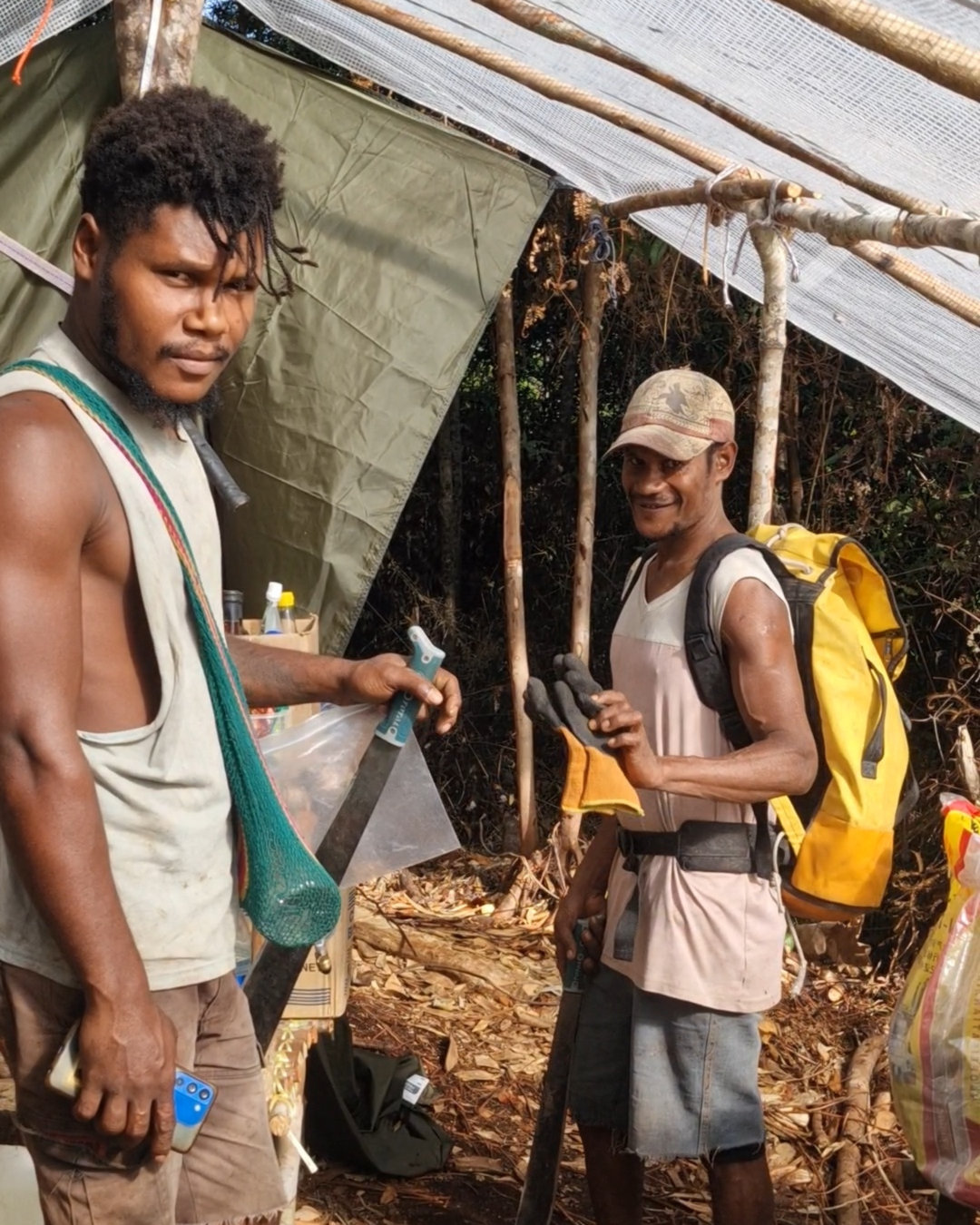 Ce matin, Joash et Brendan ont été missionnés avec pour consigne d'atteindre le lit de la Galuwé depuis le camp, de la manière la plus directe et sans utiliser de cordes. La mission est plus que bien remplie : nous seulement ils ont trouvé un accès idéal mais en plus ils sont tombés sur les traces d'une ancienne occupation. Parmi leurs découvertes, deux fragments de creusets pour moudre des aliments en pierre volcanique. Cela leur permet aussi de faire le plein d'une fougère comestible qui pousse à l'emplacement d'anciens jardins et qui agrémente très agréablement notre pitance exempte d'aliments frais.