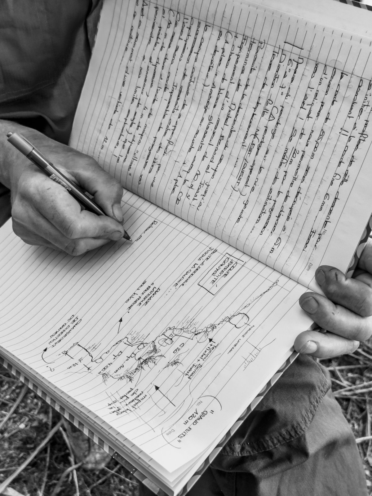 Un détail frappe les esprits : d'énormes troncs d'arbres sont coincés en hauteur dans les plafonds, rappelant la puissance phénoménale des crues qui peuvent saturer ce dédale. Ici, la nature ne murmure pas, elle gronde à chaque averse et ces témoins naturels le rappellent à chaque instant de progression. De leur coté, Michel et Denis sont affairés à la topographie. Pas un détail ne leur échappe et tout est dûment noté et renseigné.