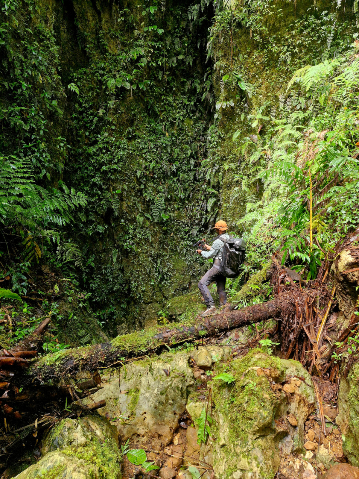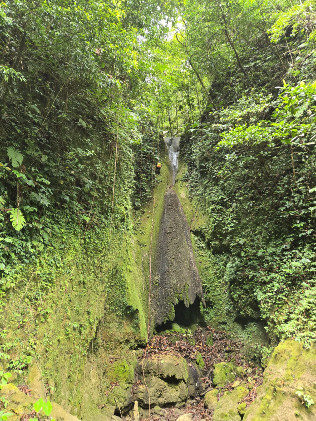 Pour le camp avancé Big-Bag, l'objectif est ambitieux : atteindre l'amont de Ralapusa via un canyon géant repéré par l'équipe de reconnaissance constituée de Jean Marc, Laurent et Nicolas accompagnés d'un de nos aides papou quelques jours auparavant. Après deux heures de progression en forêt, l'équipe débouche sur un précipice dantesque aux abords aussi impressionnants qu'instables, véritable rupture dans le relief. Bernard attaque l'équipement de la paroi, une tâche plutôt ingrate et technique : la roche saine est rare, la terre et les parties instables multiples, souvent masquée par la végétation luxuriante. Ce sol fuyant rend chaque point d'ancrage complexe à sécuriser. Après 1h30 de combat vertical, le verdict tombe, au sommet d'une dernière longueur magistrale, la vue est à couper le souffle : une descente « plein pot » de 70 mètres plonge vers un porche d'entrée de belle dimension. Les mesures sont hors normes, confirmant que nous tenons bien là le collecteur principal du système. Mais la réalité de l'expédition nous rattrape : le stock de matériel est épuisé. Plus une plaquette, plus un goujon, et une réserve de corde insuffisante pour toucher le fond. Frustrée mais lucide, l'équipe fait demi-tour, laissant à la suivante le privilège d'une "première" qui s'annonce fort belle ! La marche de retour dans la forêt a lieu sous une pluie intense.