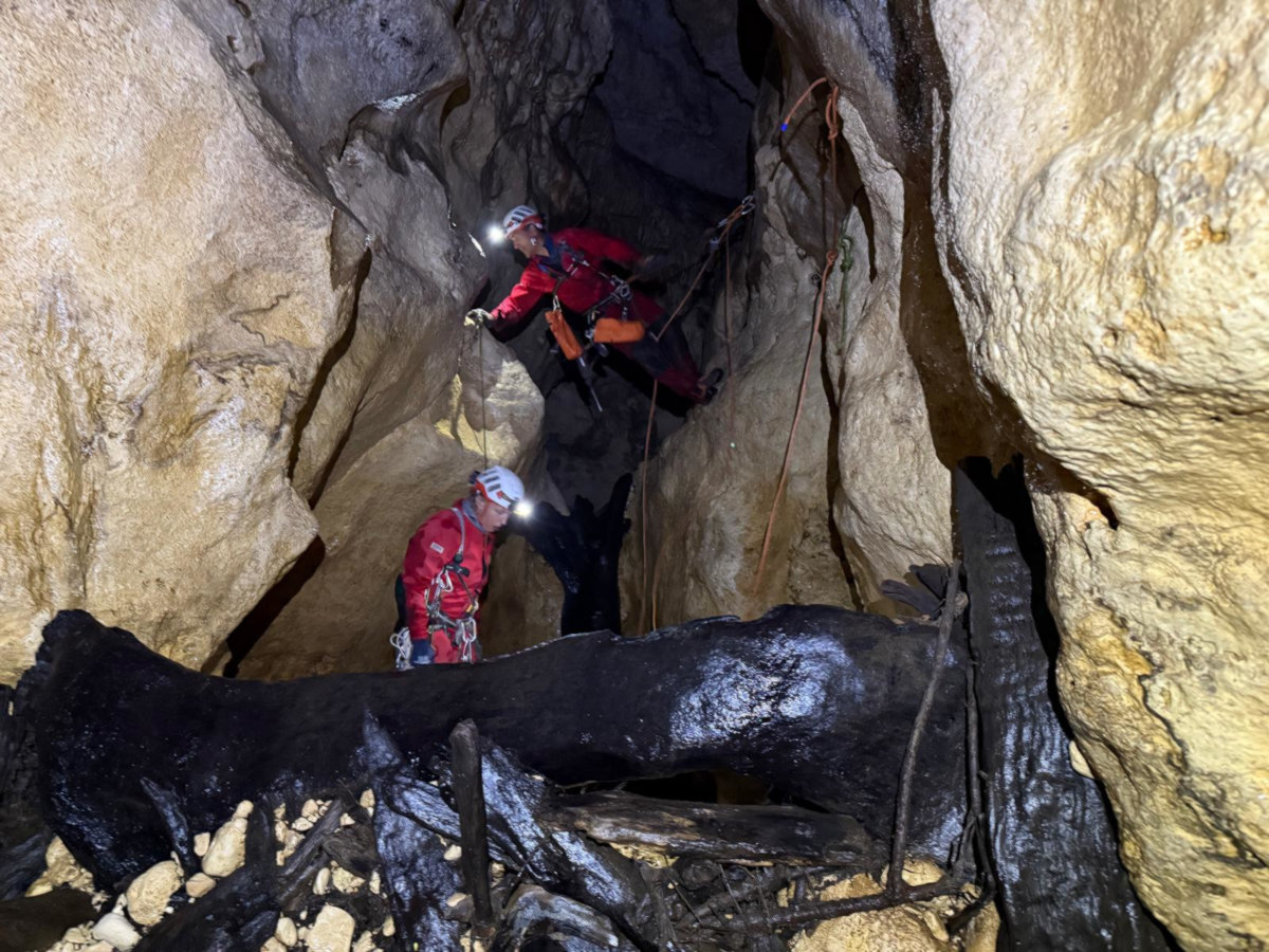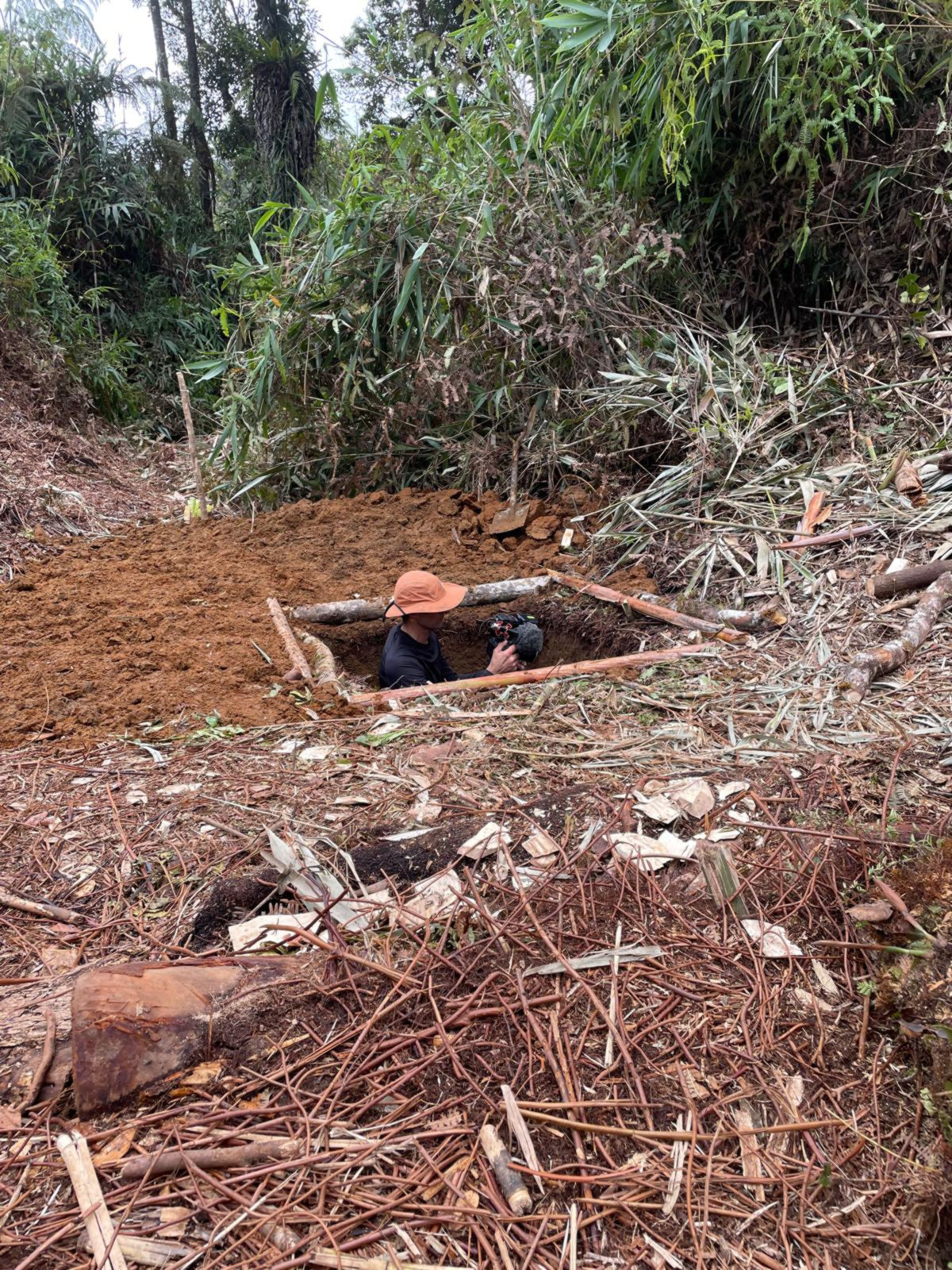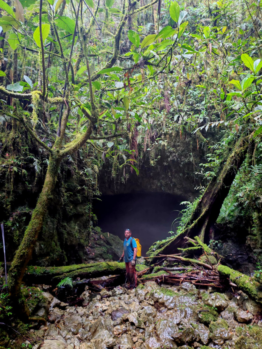 Au camp 3, l'heure est venue de faire de la spéléo ! Natalia et Franck s'attellent à l'équipement du puits du gouffre de Gauunu, suivis de Sophie et Tudor, sous l'objectif de la caméra de Yann R et Luc-Henri. Suite à la forte pluie de la veille, c'est un beau ruisseau qui s'engouffre dans la cavité et les traces de crues montrent que l'eau est bien montée pendant la nuit. Le puits, magnifique, est vite descendu. Malheureusement les choses se compliquent. Le grand volume à la base du puits mène à une zone plus modeste encombrée de blocs et de troncs, et il faut se faufiler parmi ces derniers pour gagner une petite galerie partiellement comblée d'eau. Les traces de crues sont parlantes, et bien vite le conduit principal bute sur un siphon.
