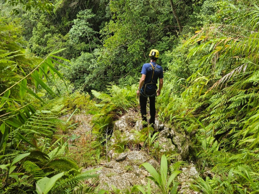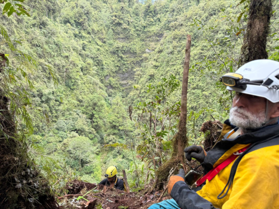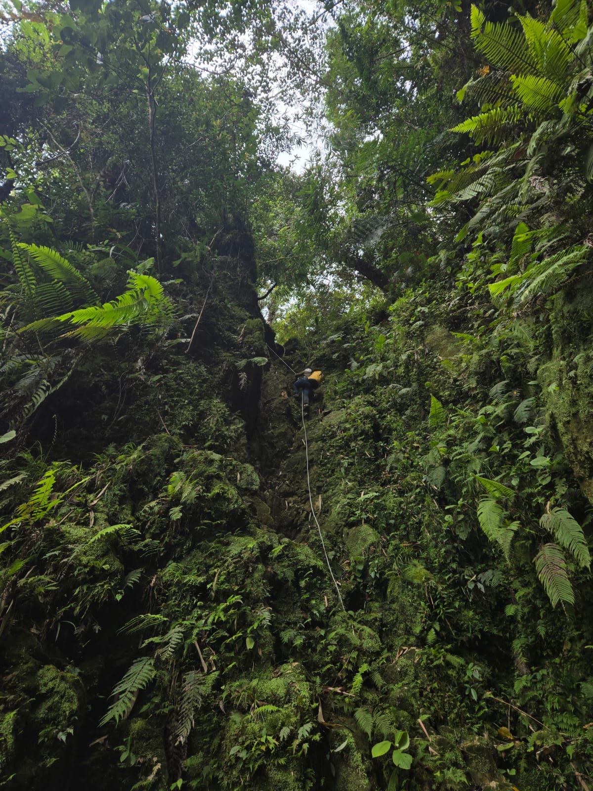 S'engager dans une telle descente ne s'improvise pas. Devant eux, un dédale de lignes possibles. Il faut lire le terrain, deviner la meilleure option, éviter les zones instables prêtes à glisser, se méfier des arbres aux racines fragiles, chercher le rocher sûr quand il affleure. Suspendus en bout de corde, ils progressent lentement, taillant à la machette tout ce qui est nécessaire pour parvenir à se frayer un passage. Chaque mètre se gagne. Chaque ancrage se réfléchit.