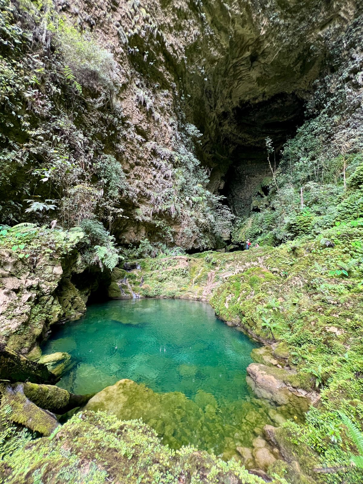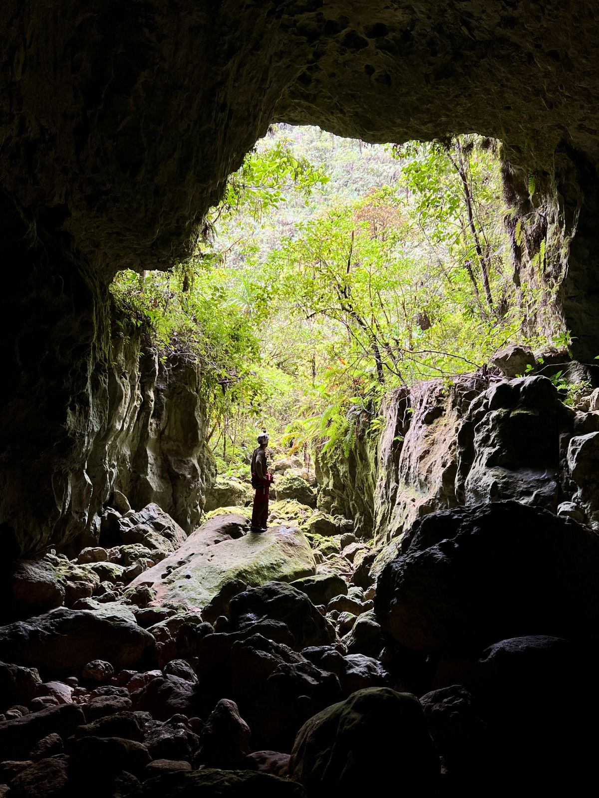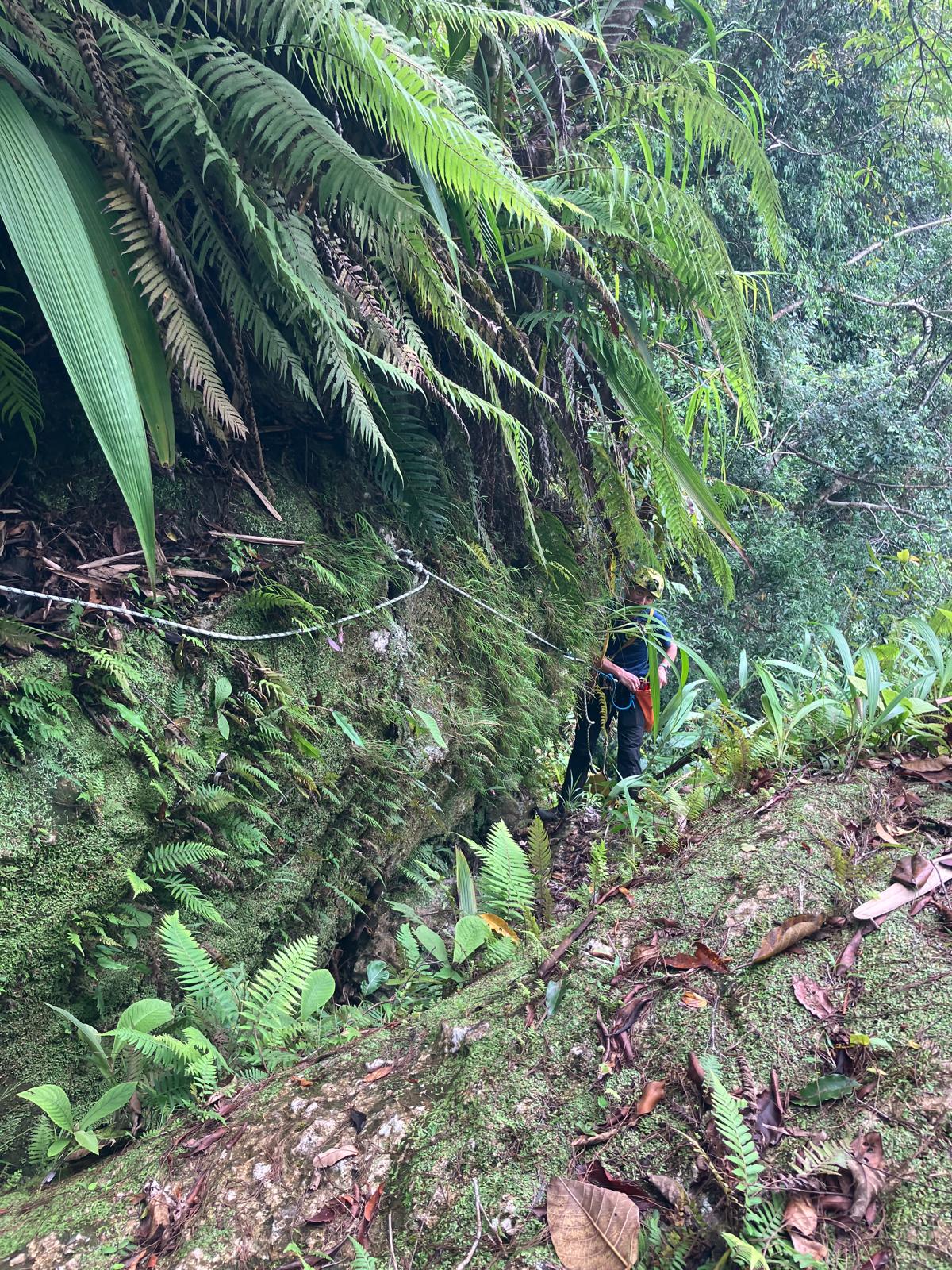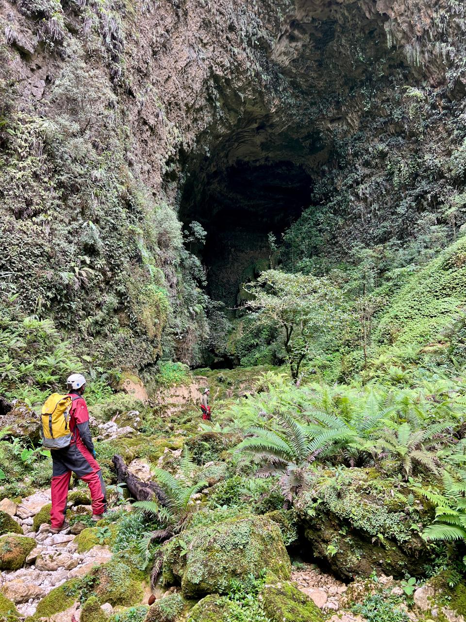 Le lendemain, une nouvelle équipe constituée de Natalia, Franck et Joash revient sur site et poursuit la descente. Elle atteint le haut d'une falaise d'où un caillou lancé dans le vide met plus de cinq secondes avant d'atteindre l'eau. « A cave ! (une grotte) » s'écrie Joash du haut d'un arbre. Une perte semble bien visible en contrebas mais l'accès reste verrouillé.