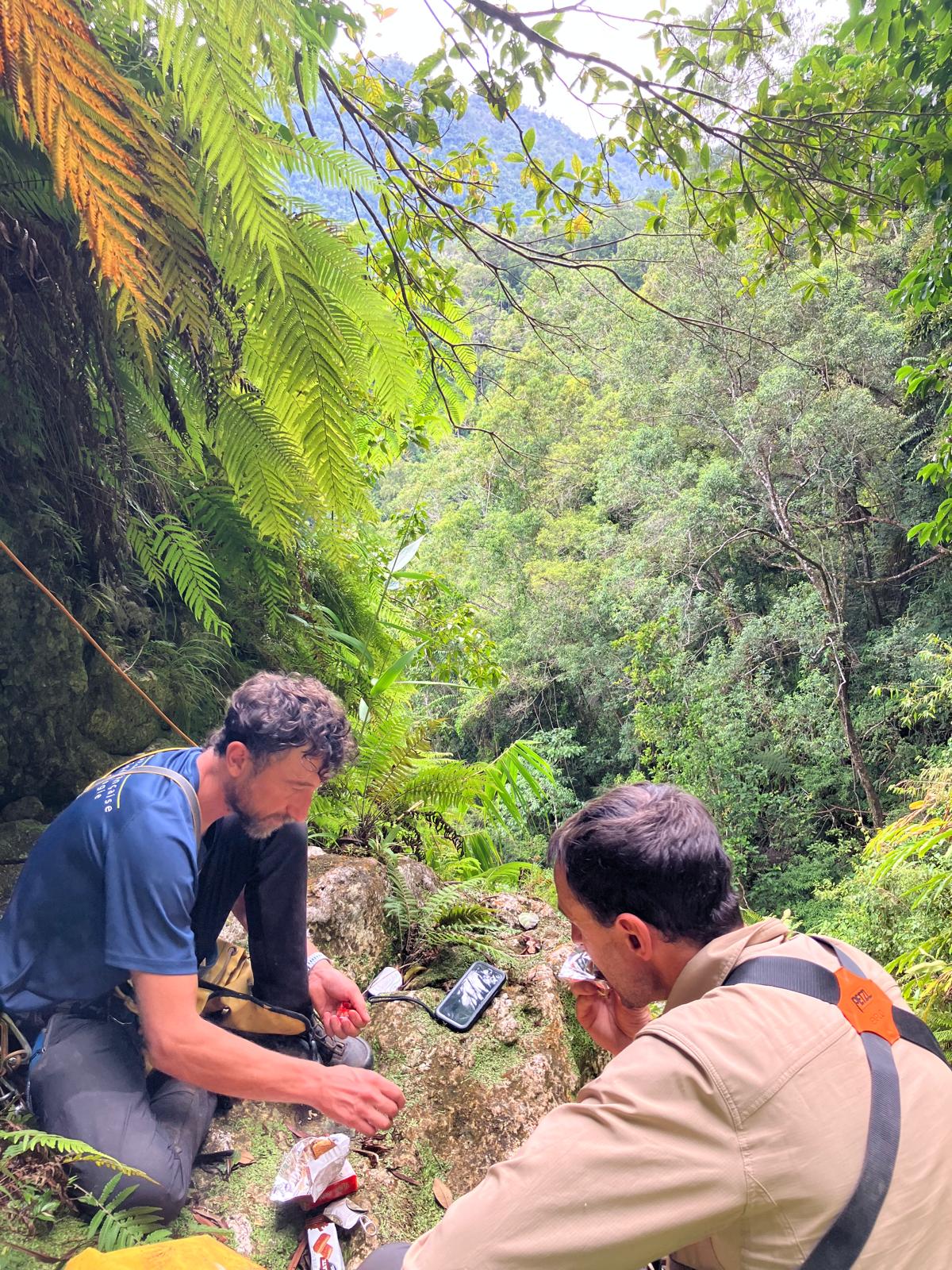 Après 1h30 d'ascension et 350 mètres de dénivelé, machette en main pour les deux Papous Jack et Nerville, l'équipe — Lionel, Sylvain, Laurent, Julien, Katia, Nicolas et Denis, guidée par Jean-Marc au GPS — atteint enfin son Graal : un point de vue baptisé « le Belvédère ». La perte est là, spectaculaire. Un vide d'au moins 150 mètres à descendre pour atteindre le fond. Sans cordes, l'équipe ne peut qu'admirer. Le plaisir est immense. La frustration aussi.