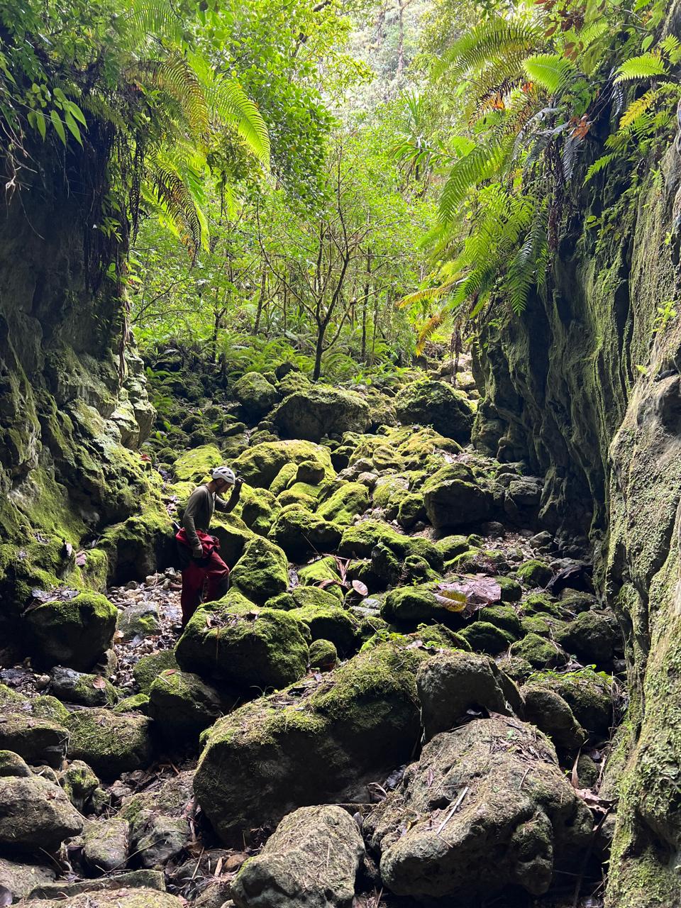 Ce n'est que le 3 février que Michel et Bernard atteindront le fond de ce canyon sec, grâce à deux jets de cordes de 10 et 15 mètres environ, fractionnés sur une fougère arborescente. Après quelques centaines de mètres vers l'aval, ils atteignent un rétrécissement marqué par un ressaut, suivi de deux marmites de géant encombrées de troncs d'arbres coincés. Le canyon devient plus encaissé, plus sinueux. Faute de matériel suffisant, ils ne peuvent franchir les obstacles.