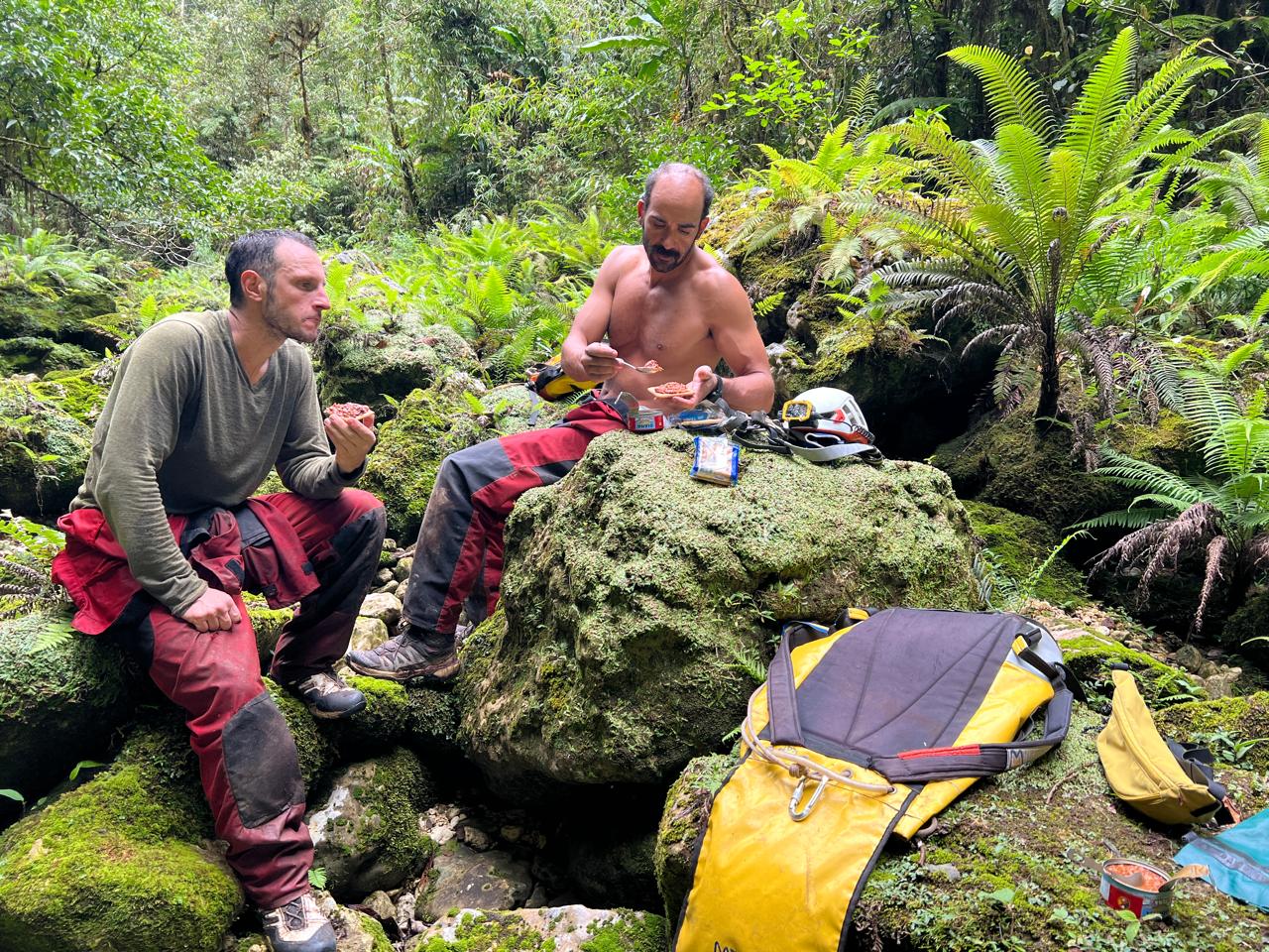 À peine le fret livré, l'exploration du gouffre Ralapusa, précédemment identifié lors d'un survol en hélicoptère, devient prioritaire sur le camp 2. Il s'agit d'un gouffre. Aujourd'hui, Nicolas, Katia et Mehdi sont de la partie. À l'aube, le camp s'éveille à peine lorsque l'équipe s'élance. À 9h30, ils sont en tête de l'objectif, sur le Belvédère, face à l'inconnu.