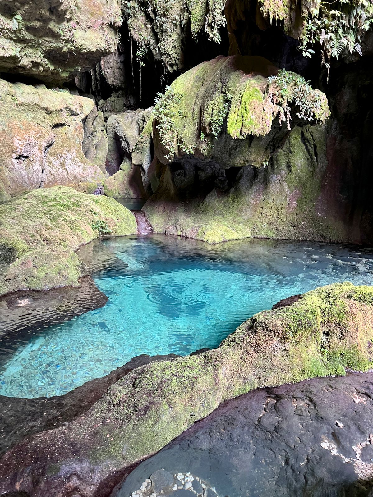 Coté amont, l'enthousiasme ne retombe pas, après une remontée de presque trois cent mètres de lit de rivière, la galerie s'ouvre, vaste et accueillante. Des vasques d'un bleu immaculé ponctuent le parcours, presque irréelles sous la lumière. Un écoulement discret, de 3 à 5 litres par seconde, accompagne la progression. La cavité est vivante. Pour les chanceux qui vivent cet instant, l'émotion est trop forte : la séquence baignade s'impose d'elle-même. Un moment simple, presque enfantin, au cœur d'un décor grandiose.