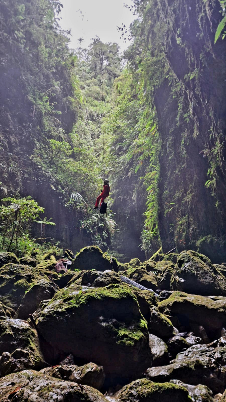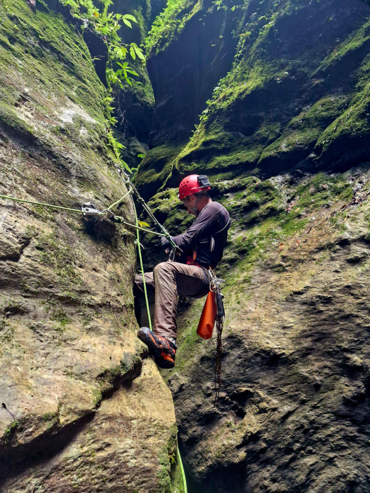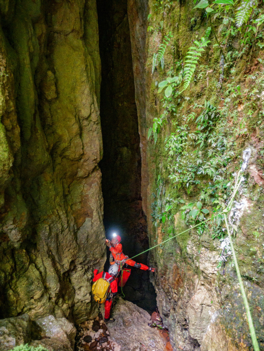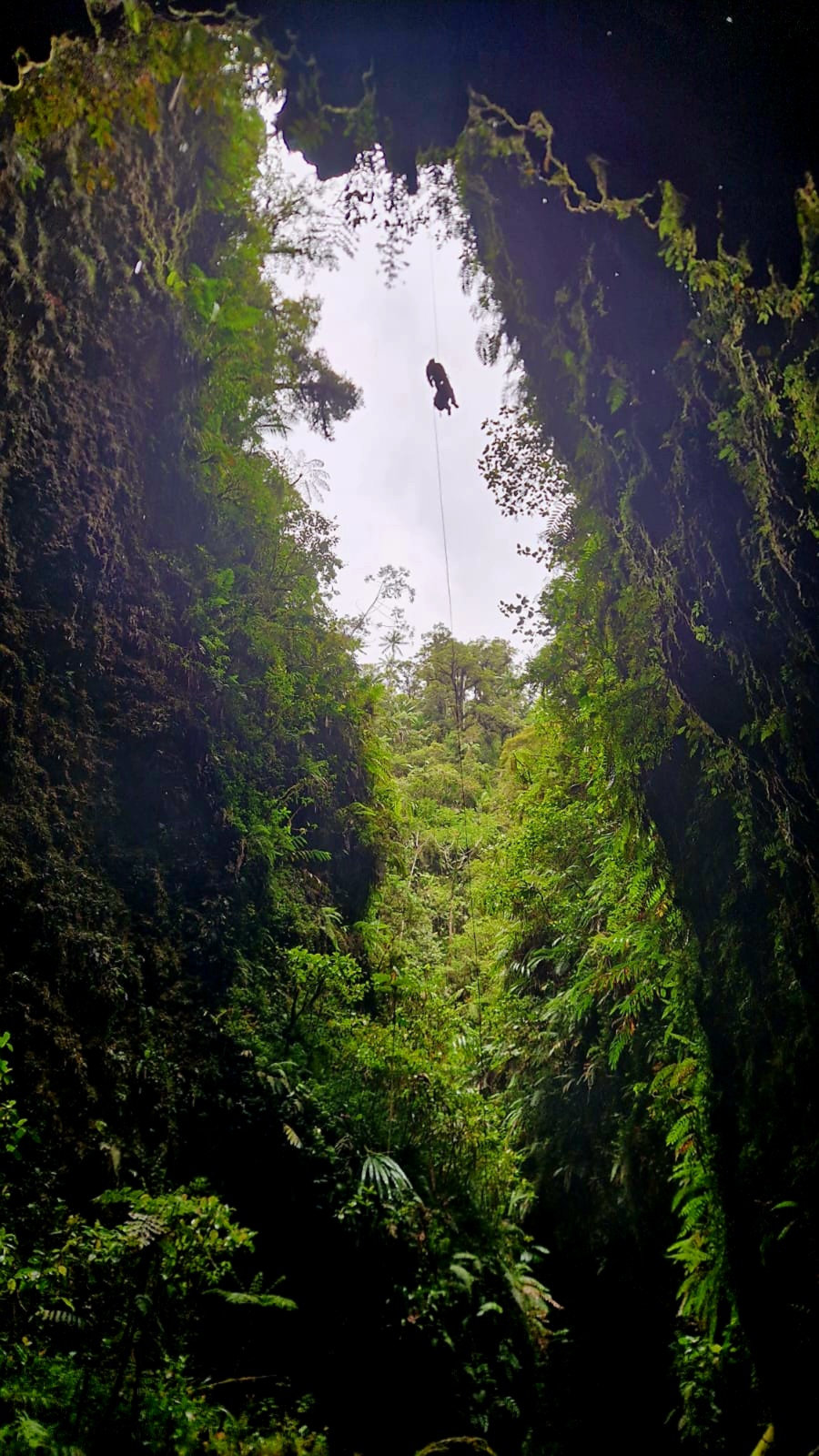 Pour le camp avancé Big-Bag, l'objectif est ambitieux : atteindre l'amont de Ralapusa via un canyon géant repéré par l'équipe de reconnaissance constituée de Jean Marc, Laurent et Nicolas accompagnés d'un de nos aides papou quelques jours auparavant. Après deux heures de progression en forêt, l'équipe débouche sur un précipice dantesque aux abords aussi impressionnants qu'instables, véritable rupture dans le relief. Bernard attaque l'équipement de la paroi, une tâche plutôt ingrate et technique : la roche saine est rare, la terre et les parties instables multiples, souvent masquée par la végétation luxuriante. Ce sol fuyant rend chaque point d'ancrage complexe à sécuriser. Après 1h30 de combat vertical, le verdict tombe, au sommet d'une dernière longueur magistrale, la vue est à couper le souffle : une descente « plein pot » de 70 mètres plonge vers un porche d'entrée de belle dimension. Les mesures sont hors normes, confirmant que nous tenons bien là le collecteur principal du système. Mais la réalité de l'expédition nous rattrape : le stock de matériel est épuisé. Plus une plaquette, plus un goujon, et une réserve de corde insuffisante pour toucher le fond. Frustrée mais lucide, l'équipe fait demi-tour, laissant à la suivante le privilège d'une "première" qui s'annonce fort belle ! La marche de retour dans la forêt a lieu sous une pluie intense.