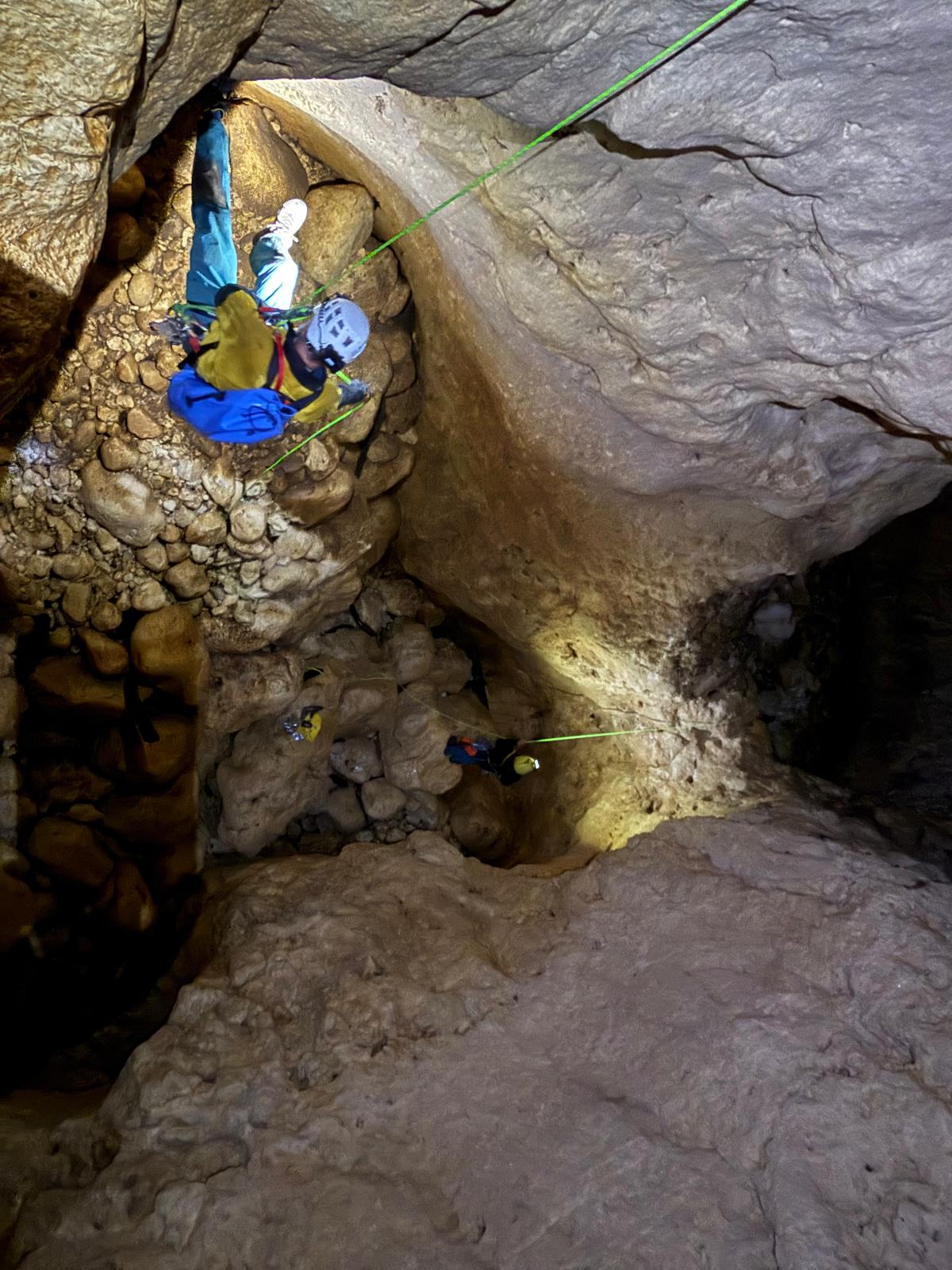 Au camp 1, nous n'avons pas de grottes, mais nous avons un canyon et des cordes : faute de grives, nous partons équiper le canyon sec de Poï sur sa partie la plus verticale qui démarre juste sous le camp. Après le rééquipement des 50 mètres de falaises qui permettent d'accéder au fond du canyon et des premiers ressauts déjà parcourus, Christophe et Didier s'attaquent aux multiples petits ressauts qui jalonnent le parcours. Partis un peu plus tard, Natalia et Franck prennent la relève. Le site est magnifique, certaines parties très encaissées nécessitent l'usage de nos frontales pour progresser. Un dernier puits oblige le premier d'entre-nous à prendre un bon bain, ce qui ajouté avec la pluie qui commence à tomber calme les ardeurs. La suite sera pour plus tard.