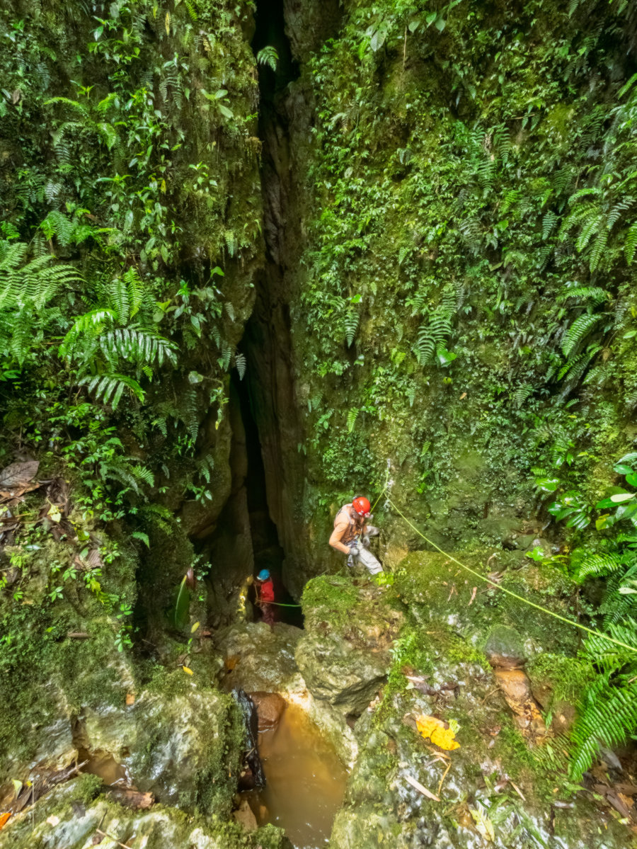 Au camp 3, l'heure est venue de faire de la spéléo ! Natalia et Franck s'attellent à l'équipement du puits du gouffre de Gauunu, suivis de Sophie et Tudor, sous l'objectif de la caméra de Yann R et Luc-Henri. Suite à la forte pluie de la veille, c'est un beau ruisseau qui s'engouffre dans la cavité et les traces de crues montrent que l'eau est bien montée pendant la nuit. Le puits, magnifique, est vite descendu. Malheureusement les choses se compliquent. Le grand volume à la base du puits mène à une zone plus modeste encombrée de blocs et de troncs, et il faut se faufiler parmi ces derniers pour gagner une petite galerie partiellement comblée d'eau. Les traces de crues sont parlantes, et bien vite le conduit principal bute sur un siphon.